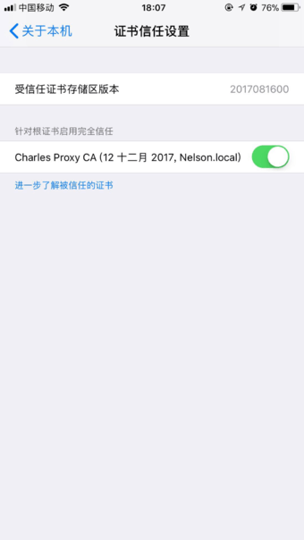 设置 -> 通用 -> 关于本机 -> 证书信任设置,开启完全信任