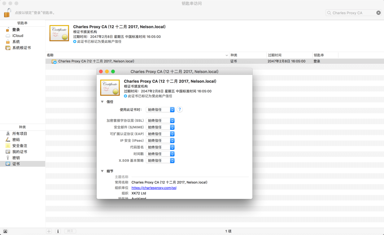 Help -> SSL Proxying -> Install Charles Root Certificate 此时会打开钥匙串访问安装Charles Proxy CA证书,双击证书,展开信任选项,选择始终信任,如果证书安装不了请搜索Charles Proxy CA,删除就已失效证书再进行安装操作.