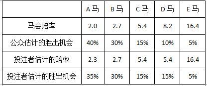 一场比赛有A、B、C、D、E五匹参赛马匹。独赢彩池的赔率为:A为2.0,B为2.7,C为5.4,D为8.2,E为16.4。赛马会返奖率为82%,则投注比例、公众估计的马匹胜出机会的计算如下: